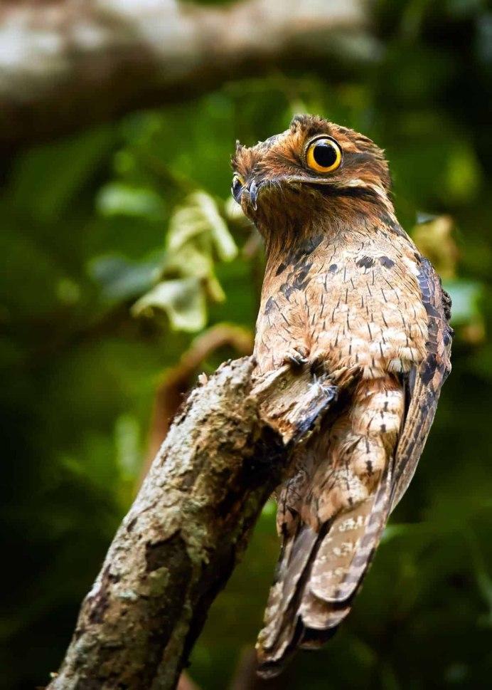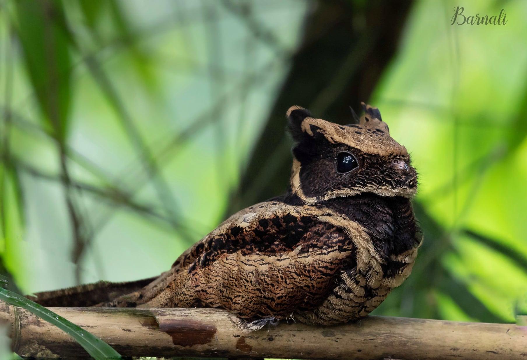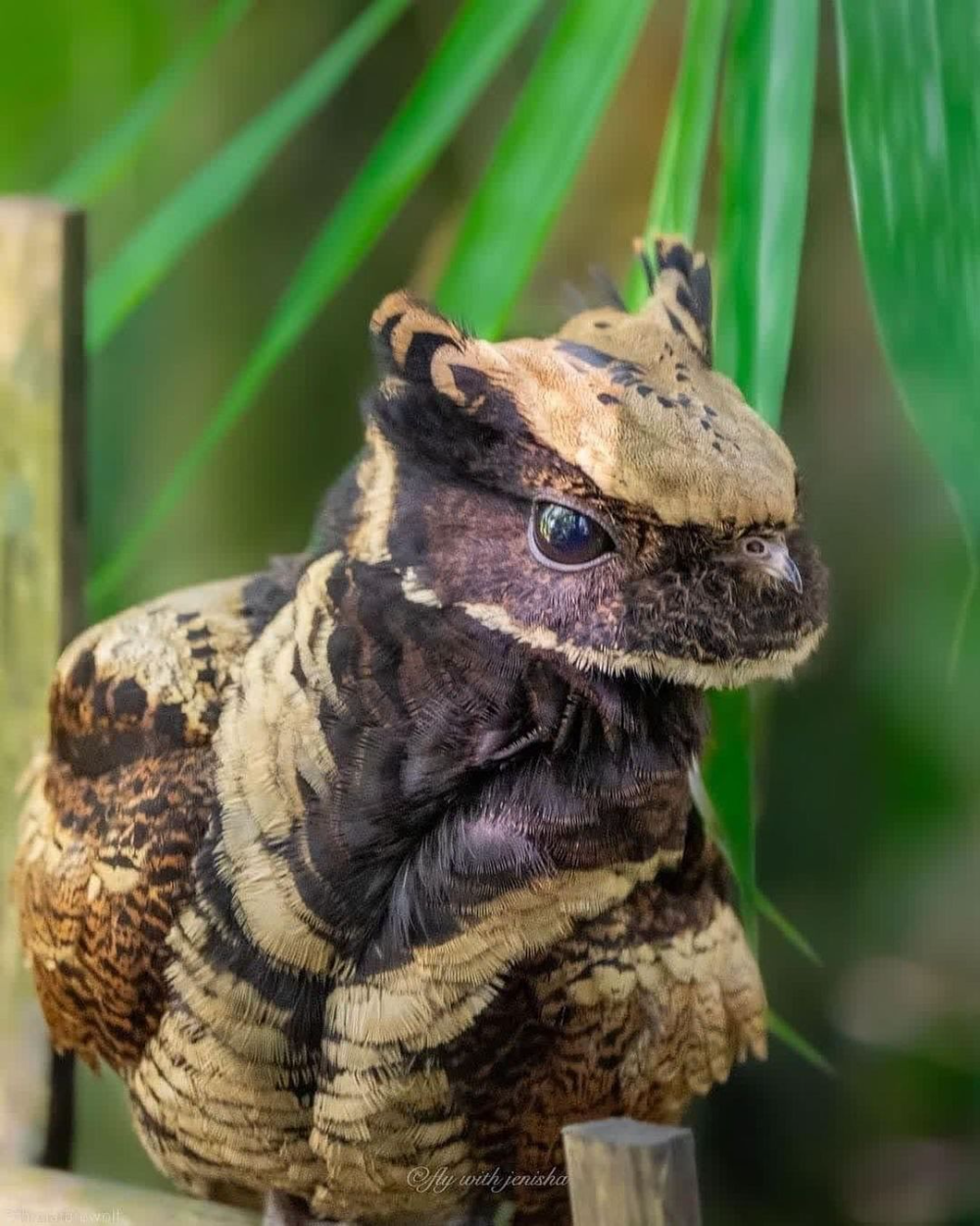 У этой харизматичной птицы полосатые крылья и светлая полоса на горле. Но больше всего выделяются длинные, похожие на рысьи ушные хохолки, благодаря которым эта птица получила латинское название: Lyncornis macrotis, что буквально означает «длинноухая птица-рысь».