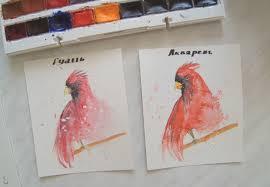ГУАШЬ - краска плотная, матовая, непрозрачная, легко перекрывает предыдущие слои, добиваясь насыщенных цветов. Не растекается, ею можно делать четкие рисунки. Ниже приведены примеры рисунков акварелью и гуашью. Как говорится "почувствуйте разницу")