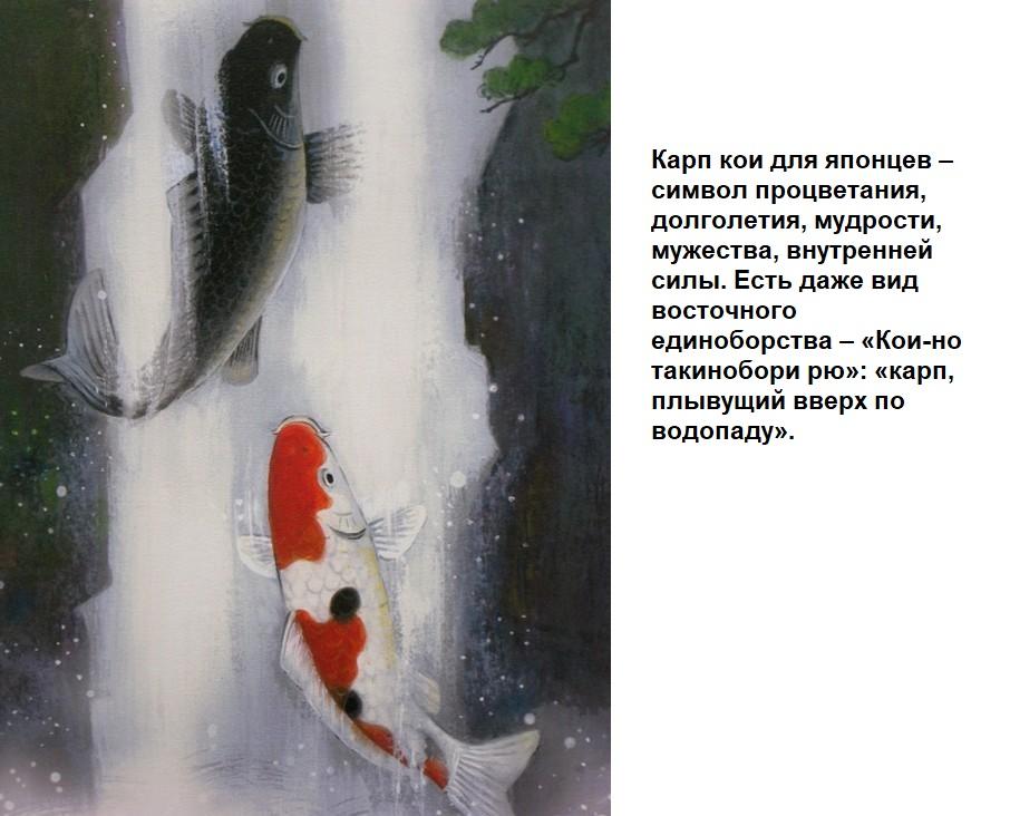 Карп, плывущий на нерест вверх по водопаду, стал и символом доблести самураев, ибо он проявляет самоотверженность, и только смерть может остановить его: выбора нет, только вперед. И только карп, преодолевший водопад, становится драконом.