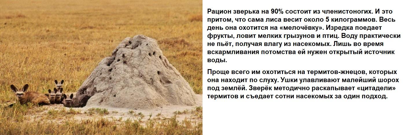 Главная странность зверька — его зубы. В пасти их 48, это больше, чем у любого наземного млекопитающего такого размера. Маленькие, острые, они идеально подходят для поедания хорошо защищённой добычи: жуков, термитов, сверчков. Чтобы насекомые не ответили укусом, большеухая лиса жует с невероятной скоростью — до 10 движений челюстями в секунду! Человек за это время сделает только один укус.