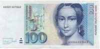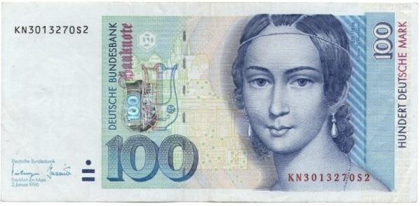На купюре достоинством 100 DM воспроизведен портрет прекрасной женщины - великой пианистки Клары Шуман. Так выглядела Клара Вик в день своей свадьбы с композитором Робертом Шуманом. Её концертная деятельность простиралась на всю Европу - от России до Англии. С 1850 года семья Шуман живёт в Дюссельдорфе, где Клара начинает заниматься педагогической деятельностью. После смерти Роберта Шумана Клара осталась с восемью детьми, но продолжала концертную деятельность, пропагандируя произведения мужа. Последний концерт Клара Шуман дала в возрасте 72 лет.Великолепный,"с иголочки" портрет этой замечательной женщины.